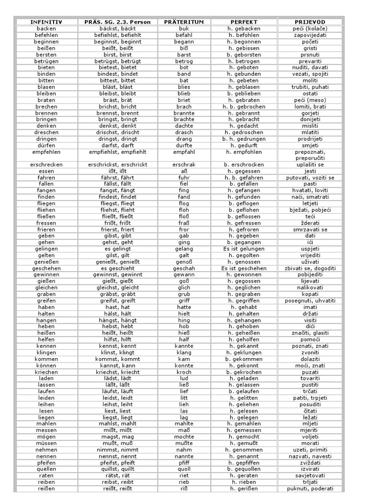 Njemacki Tabela Nepravilnih Glagola Docsity
