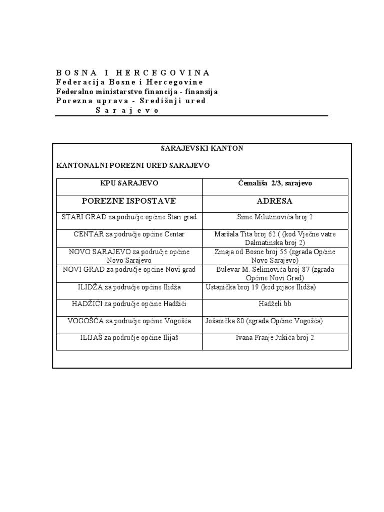 Adrese Kantonalih Poreznih Ureda I Poreznih Ispostava